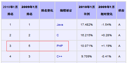 根据“TIOBE编程语言排行榜”(榜单虽然统计方式有局限,但是仍然不失为一个比较好的参考),2010年PHP最高曾经在世界编程语言中排名第三。可见,PHP语言在PC互联网时代的Web领域可谓叱咤风云,擎天一柱。