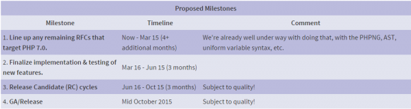 虽然PHP7的正式版本可能要到2015年的10月份才发布,不过明年6月份应可以看见一个测试版本了,之后是3-4个月的质量保证。