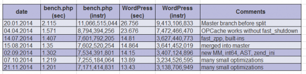 上面的特性中,最令人期待的就是PHPng的性能优化,PHP社区已经放出了一些性能的测速数据。从数据上看,PHPng的执行性能比起项目启动之初,已经有接近1倍的提升。这个成绩已经非常不错,况且,最关键的是PHP7的优化计划还有很多尚未完成。等到都全部完成了,相信我们可以看见一个性能更高的PHP7。