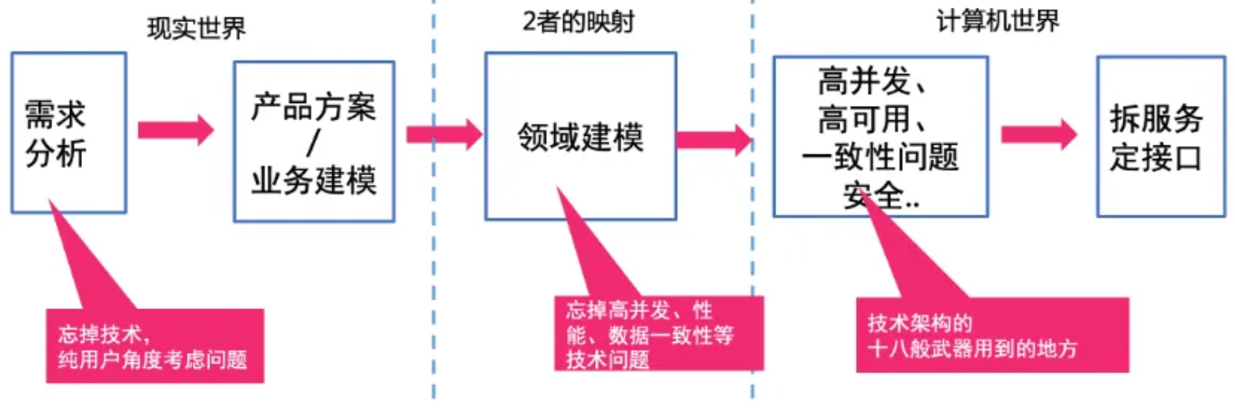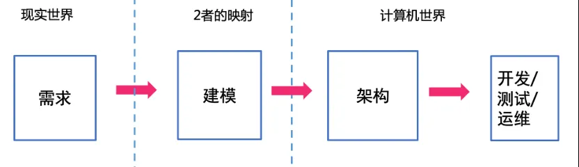 从需求到最终代码上线,也即完成现实世界->计算机世界的一次映射,在这次映射中,有3大复杂领域,之后就是写代码、测试、发布上线。