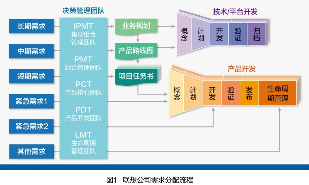 第五,其他需求。指在产品生命周期管理期间需要通过产品升级满足的需求,可分为两类:一是临时需求,需要通过临时产品升级实现;二是根据技术发展或业务运营需要,通过提前计划好的升级满足的需求,这些需求往往按照一定节奏分批落实,工作由生命周期管理团队(LMT)或PDT负责,由生命周期管理委员会(PLMC)或IPMT做最后决策。联想公司需求分配流程如图1所示。