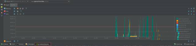 将手机连接电脑病开启USB调试选项,打开Android Studio并点击底部的“Android Monitor”,选择待测的设备与进程,即可看到GPU Monitor的监控结果。以6.0系统为例,可以看到,GPU Monitor中呈现的信息实际上与GPU呈现模式分析中在手机屏幕上显示的柱状图是相同的。