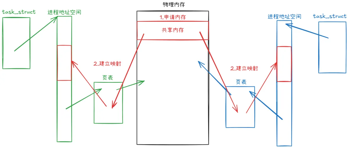 用户向OS另外申请一块额外的内存空间,不同的进程再分别把申请拿到的内存空间映射到自己的进程地址空间中就可以同时进行读取和写入了。