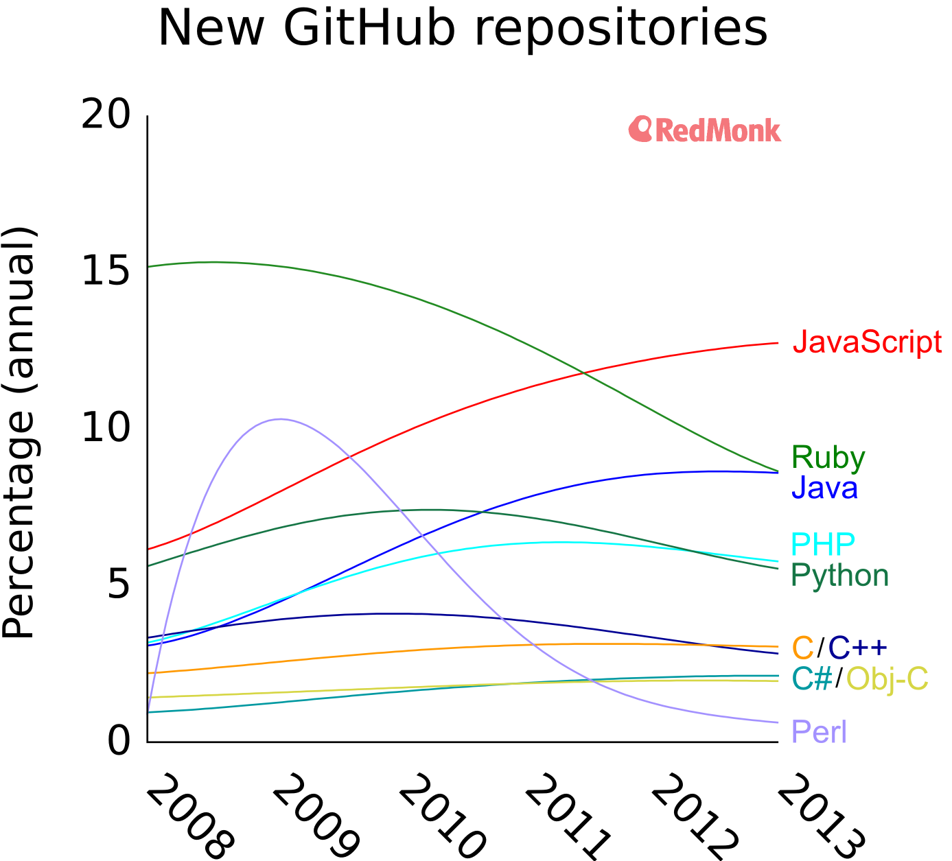 RedMonk公司通过收集Github上的数据分析了近几年编程语言的受众度。从图中可以看出:Javascript呈现出稳步增长的趋势;Ruby下降幅度较为明显;Python也有下降趋势,但幅度并不明显也不及Ruby;而Java增长趋势较为平缓,它是JVM语言中唯一呈现增长趋势的语言。