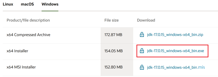 Neo4j的运行需要Java环境,根据 官方文档 要求, 5.26(LTS) 版本的Neo4j需要安装JDK17或者JDK21。JDK的安装包可从 Oracle官网 下载(需注册账号并登录),或者直接从课程资料中获取。
