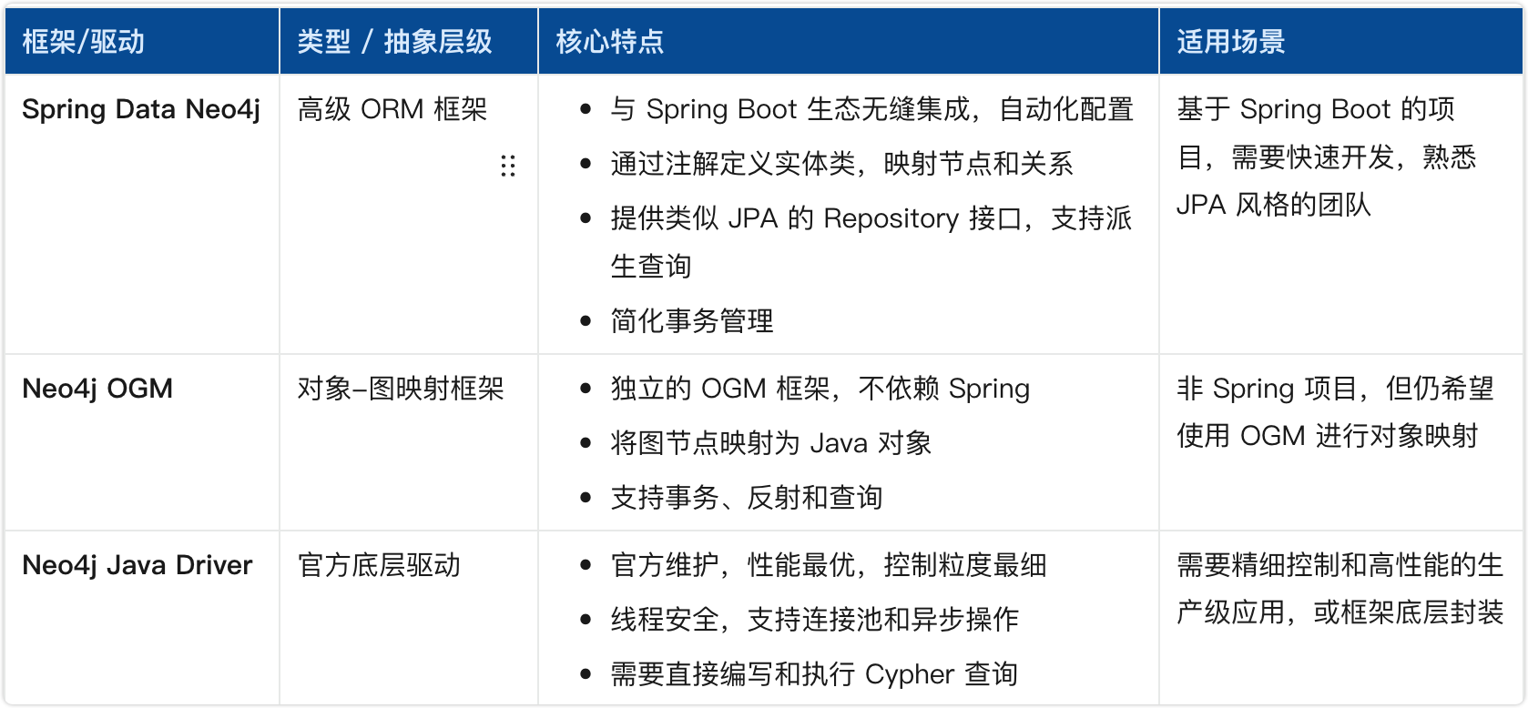 - 原生控制 :当需要执行复杂 Cypher 查询或对 性能 有极致要求时,可以直接使用 Neo4j Java Driver ,它在提供强大控制力的同时保证了效率。