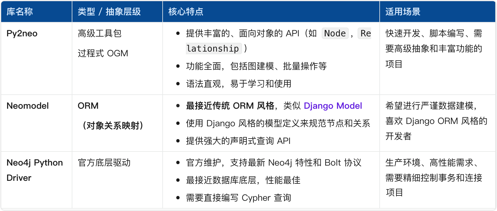 - 项目架构 :若为 Spring Boot 项目, Spring Data Neo4j 是自然之选。对于 Python 中小型项目或脚本, py2neo 和 neomodel 都能提供很好的开发效率。