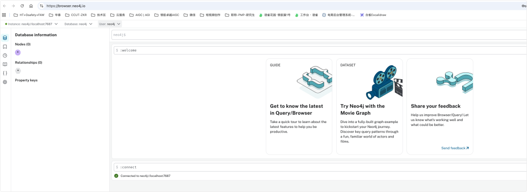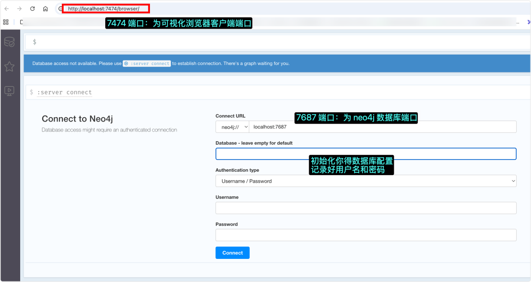 启动成功后, neo4j 会提供一个 web 页面作为客户端,访问地址为 http://localhost:7474/browser ,初始用户名和密码均为 neo4j 。初次登录需要修改密码。