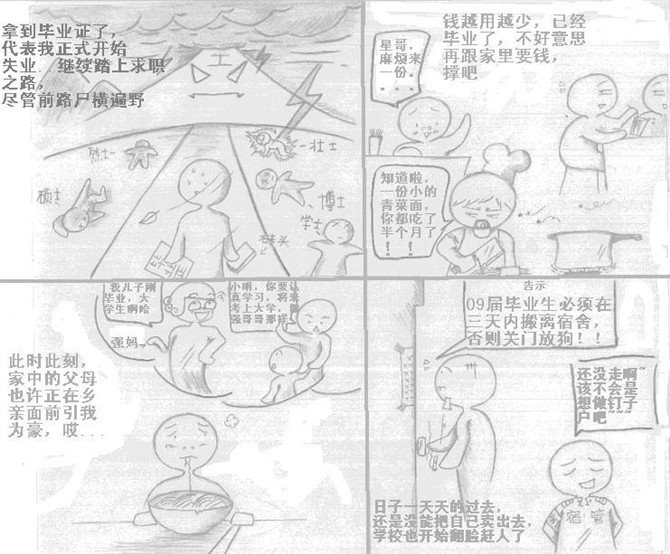 毕业了,失业了,面对史上最难的就业形势,我这个小小的应届毕业生在广州这个大大的城市里艰难地爬行着,烈日下、暴雨中,匆匆奔走在每一条大街小巷,苦苦寻找每一个可能的机会。理想,梦想,早已不敢想,迫切需要解决的问题,就是一日三餐。不去憧憬未来,只有空空的口袋。奔波之余,愿以文字图画记录一个普通毕业生的生存实录,与所有今年毕业的兄弟姐妹们共勉:加油加油,顶住顶住,争取早日把自己卖出去,死了都要卖!在人来人往的大城市里,到处可见富人们的宝马香车,而我们一无所有,像小强一样爬来爬去。我们是小强,我们是踩不死的小强,就算生活把我踩上一千脚,我也还是顽强地活着,不停地爬来爬去——不管是活着,还是死去