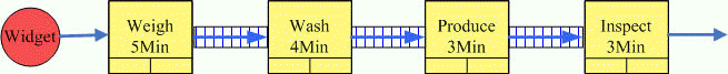 某企业在一条流水线上加工一种产品,该产品所需的零部件(Widget)经过称重(Weigh)、冲洗(Wash)、加工(Produce)和检测(Inspect)四个工序的操作后,形成产品离开系统,生产线布置如下图所示。