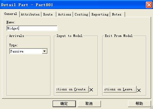 在布局区 双击Part001元素图标, 在弹出对话框中进行相关设计。因为在流水线生产系统中,零部件的数量足够多,只要第一道工序空闲,需要提取零部件进行加工就可以获得零部件,因此设计零部件元素类型为缺省值:被动型(Passive)。然后在Name栏中将