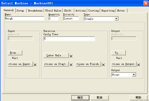 在Cycle Time栏中输入5,表示零部件在该台机器上所需的加工时间为5个仿真时间,在模型中,取每个仿真时间单位表示实际系统的1分钟;