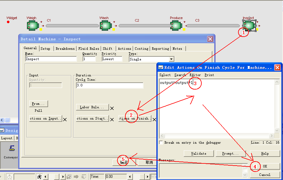 Time栏中输入3,点击确认键确定。 本模型还需要实时统计该流水线加工完成的零件数量,并将其记录在变量output中,这需要每当Inspect机器加工完成一个零件,变量output的数量要增加1,实现该功能的步骤为:(1)双击机器Inspect的图标;(2)打开其细节设计对话框,在其对话框中点击按钮:Actions