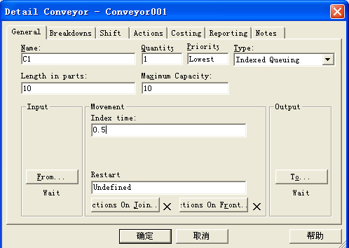 双击Conveyor001图标,出现下图所示的输送链细节设计对话框。在Name栏中输入C1,在Index