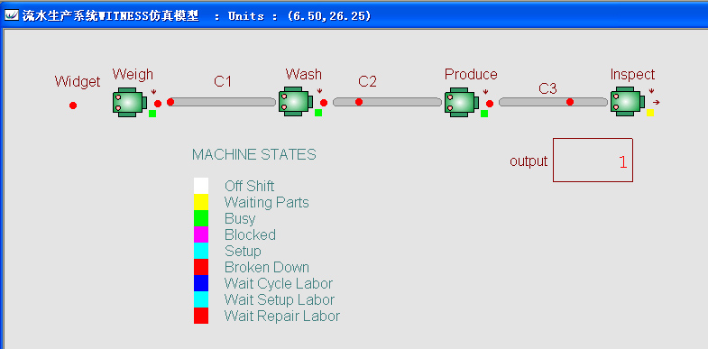 生产线上每道工序只有一台设备,零部件在每台设备上加工完毕后,由同其连接的输送链运输至下一设备,最后经过检测后被送出系统。已知该流水线中各个工序的加工时间分别为:称重(weigh)5分钟、冲洗(wash)4分钟、加工(produce)3分钟、检测(inspect)3分钟。每条输送链上有20个零件位,输送链上零件移动节拍为0.5min。零部件的供应是源源不断的,不存在缺货现象。使用WITNESS建立该系统的仿真模型界面如下图所示,模型下载。