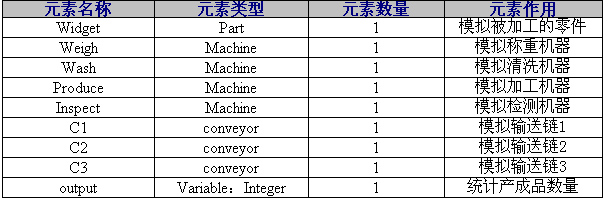 该流水线系统的组成元素主要为被加工的零部件、四台设备和三条输送线,因此该系统仿真模型的元素如下表所示:被加工的零部件由widget表示,4道工序分别由四台机器表示,C1、C2、C3表示输送链,而最后的实际产