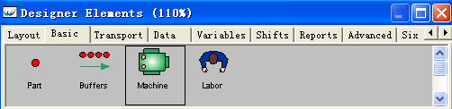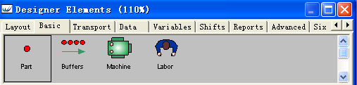(2)建立一个零部件元素。在 上图WITNESS界面下方的Designer Elements窗口的Basic页中,鼠标单击选中Part元素