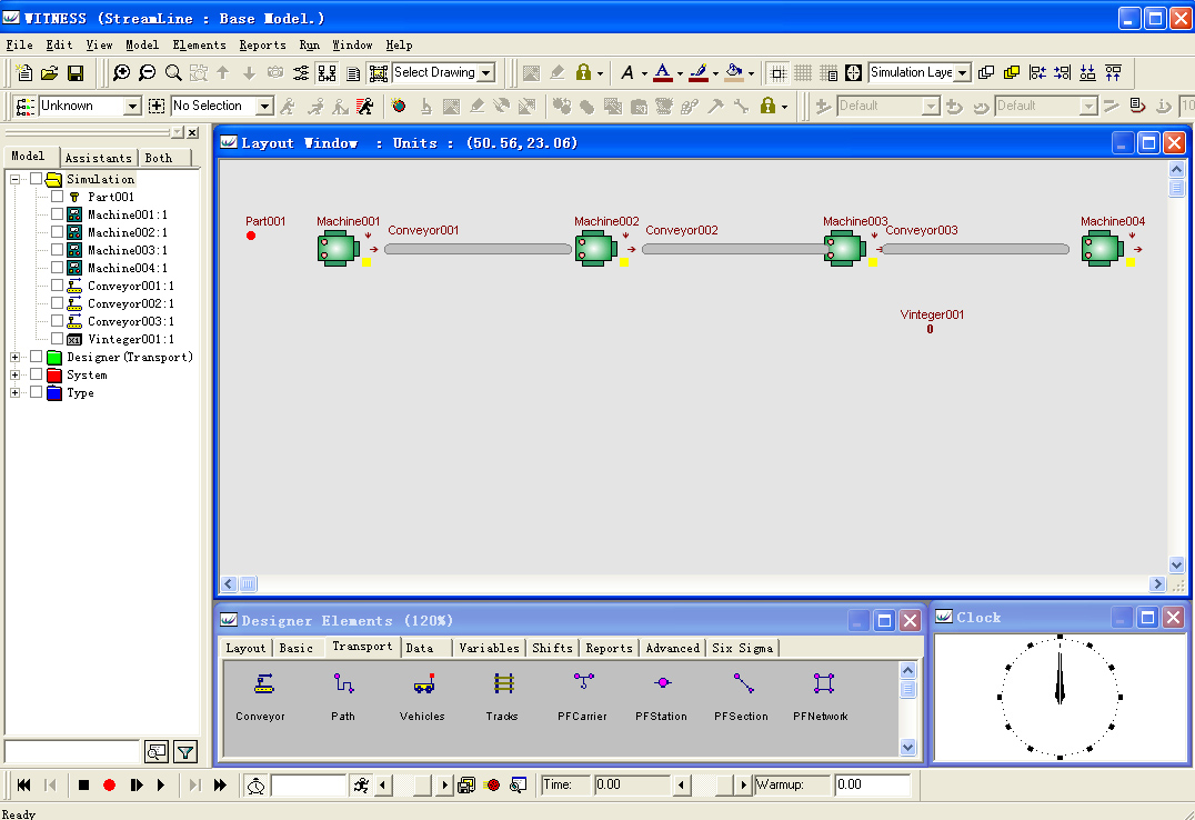 在3.1节完成系统元素定义的模型上尚不能做仿真实验,因为这些元素还没有设置符合流水线系统运行行为的数据和特征,例如机器设备每次的作业时间、机器设备完成某件产品作业后将产品送到何处去、输送线的长度和速度等。在WITNESS建模与仿真过程中,对模型元素的运行行为和特征进行设计称之为对元素的细节设计。元素细节设计是建立仿真模型中最为重要的一个阶段,如果元素的作业时间设计不准确,或者元素的输入/输出规则设计不准确,都将使得仿真模型的运行行为同实际系统不匹配,导致仿真结果不能正确的反映实际系统的运行状态和存在的问题。