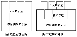 传统的项目组织内知识结构是两层的,如图(a)。项目团队的知识以成员个体信息的形式存在,协作性差,虽然从显性知识层面看,项目的知识管理可以把各种信息统一组织起来,但是在隐性知识层面上,项目组织做不了什么,知识结构仍然是被割裂开的——项目成员可能只是应付性地撰写报告、某个项目成员极有可重用价值的经验总结可能根本不为人知或是没人能理解、因为少数关键人员的离职甚至可能造成项目失败的风险。