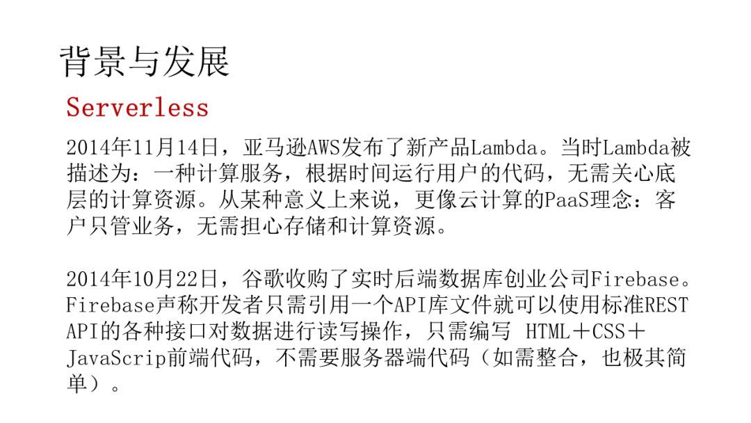 FaaS的出现也是服务发展的必然趋势,在微服务大行其道的现在,FaaS作为服务函数的出现,在服务细粒度实现和计费上给出了很好的解决方案。目前这块属AWS的lambda做的最好了。
