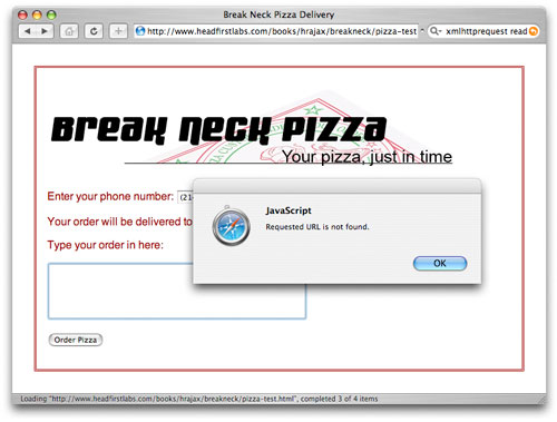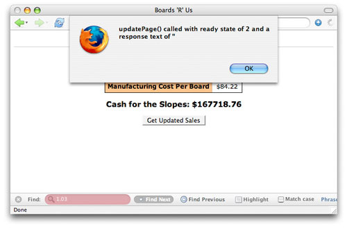 这段代码就是 onreadystatechange 意义的一个确切展示 —— 每次请求的就绪状态发生变化时,就调用 updatePage(),然后我们就可以看到一个警告了。图