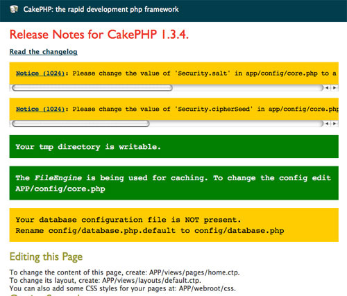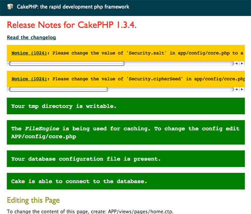 图 3. CakePHP 默认主页改为显示数据库配置的状态