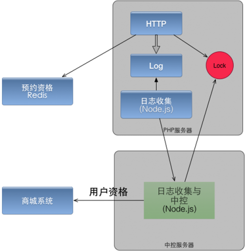 系统基本原理:在PHP服务器上,通过一个文件来表示商品是否售罄。如果文件存在即表示已经售罄。PHP程序接收用户抢购请求后,查看用户是否预约以及是否抢购过,然后检查售罄标志文件是否存在。对预约用户,如果未售罄并且用户未抢购成功过,即返回抢购成功的结果,并记录一条日志。日志通过异步的方式传输到中心控制节点,完成记数等操作。