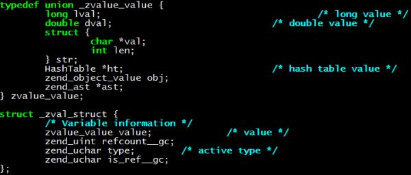 这个结构体将会占据远比C变量多得多的内存,PHP中定义方式如下: