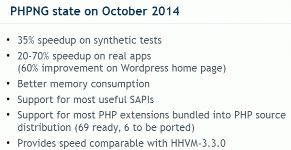 上面的特性中,最令人期待的就是PHPng的性能优化,PHP社区已经放出了一些性能的测速数据。从数据上看,PHPng的执行性能比起项目启动之初,已经有接近1倍的提升。这个成绩已经非常不错,况且,最关键的是PHP7的优化计划还有很多尚未完成。等到都全部完成了,相信我们可以看见一个性能更高的PHP7。