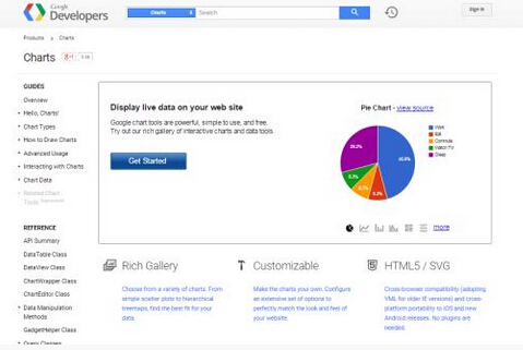 Google Charts 提供大量不同种类的图表,它最大程度上满足了数据可视化的需要。图表基于 HTML5/SVG,为了兼容老版本的 IE 还支持 VML。所有的图表都是可交互,可缩放的。你可以去看看他们的图表库。并且最棒的部分是他们的图表绝对免费。