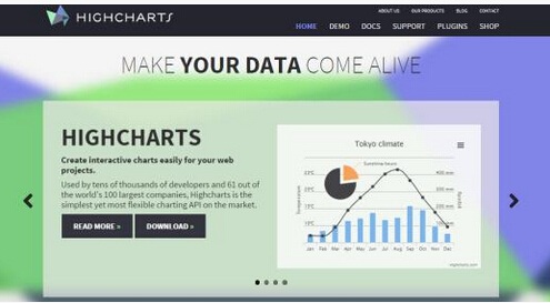 Highcharts 是又一个流行的交互图表库,与其他库一样,它是基于 HTML5/SVG/VML,所以不需要扩展插件。提供的图表类型很广泛,像曲线图,柱状图,条形图,地图,仪表盘等。