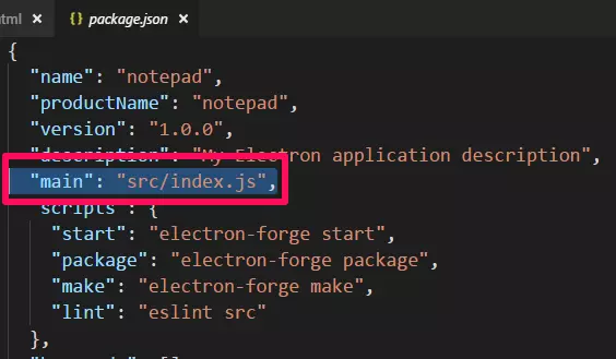看一下package.json,注意这里默认已经将主进程入口文件配置为index.js(而不是main.js)。