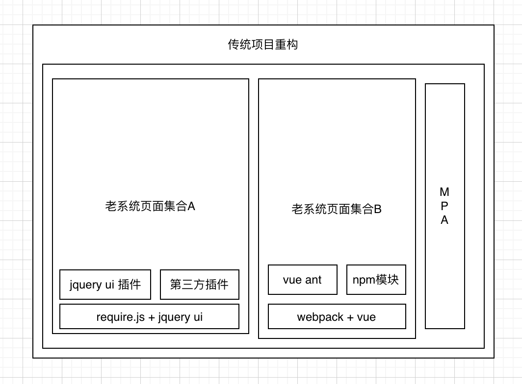 这种情况我们需要做评估和拆分, 如果是小模块, 我们可以用 jquery插件 的方式快速爹迭代, 如果是页面级别的迭代, 并且交互比较复杂, 我们可以将老系统的新页面拆离一个子工程, 采用最新的框架(如vue)来开发迭代, 再通过 MPA 的方式和老系统做集成: