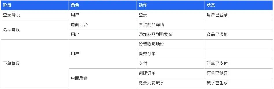 动作是指参与者发起的某个命令,比如创建订单、抽奖等,而状态是指动作发生后引起的状态变更,比如订单已创建,订单创建失败等,其概念类似事件风暴的命令和事件。