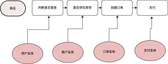 在以上例子中,将动作、状态归类后,可划分为用户、购物车、商品、订单、消费流水五个实体,收货地址可作为值对象。