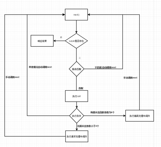 handle函数中使用闭包函数next来检测layer是否与当前路由相匹配,匹配则执行该layer上的中间件函数,否则继续检查下一个layer。