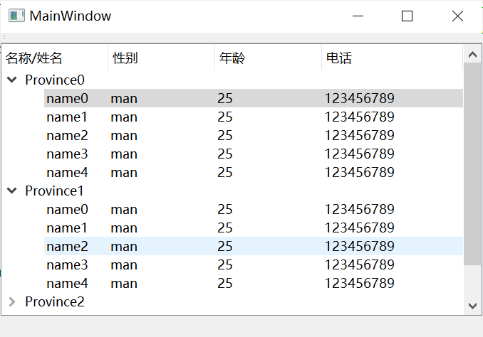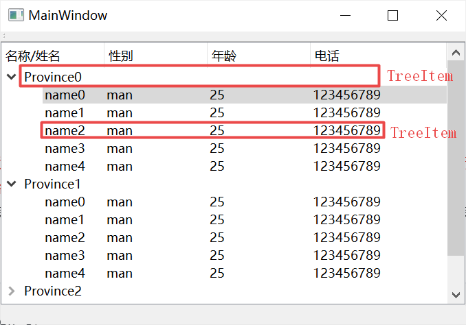 void MainWindow::setModel(const QVector<Province *> &proList) headers << QString("名称/姓名") TreeModel* model = new TreeModel(headers, treeView); TreeItem* root = model->root(); foreach (auto pro, proList) TreeItem* province = new TreeItem(root); province->setType(TreeItem::PROVINCE); root->addChild(province); foreach (auto per, pro->people) TreeItem* person = new TreeItem(province); person->setType(TreeItem::PERSON); province->addChild(person); treeView->setModel(model);