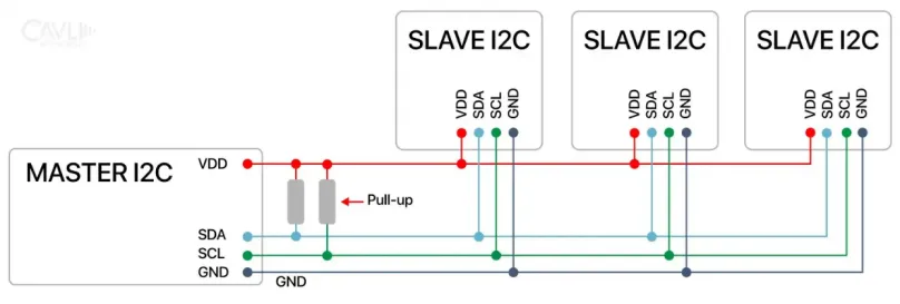 I²C 采用共享总线结构,所有设备通过两根信号线连接在同一条总线上: