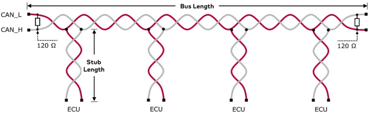 - 差分信号传输(CAN_H/CAN_L),有效抑制共模干扰;
