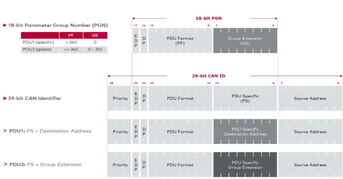 J1939 使用 29 位扩展 CAN ID,在 ID 中编码了优先级、参数组号(PGN)和源地址,从而实现更清晰、标准化的数据表达。