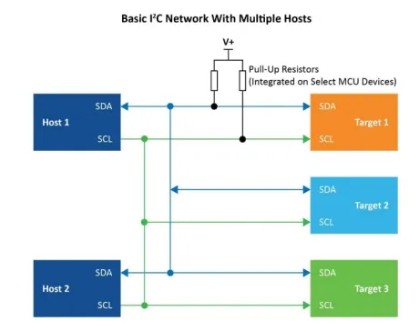 I²C 支持主从通信模式,并且在协议层面支持多主机(Multi-Master)能力,即多个主设备可以共用同一条总线,并通过仲裁机制避免冲突。这在某些复杂系统中可以提升架构灵活性。