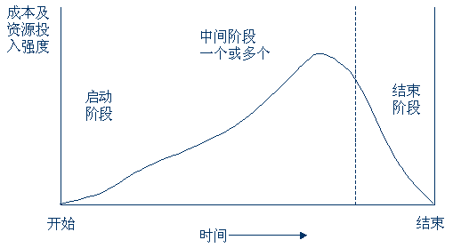 一个项目的资源投入强度,一般会随着时间的推进而逐步加大,到达顶峰,然后随着项目的结束而降低,如下图 2。