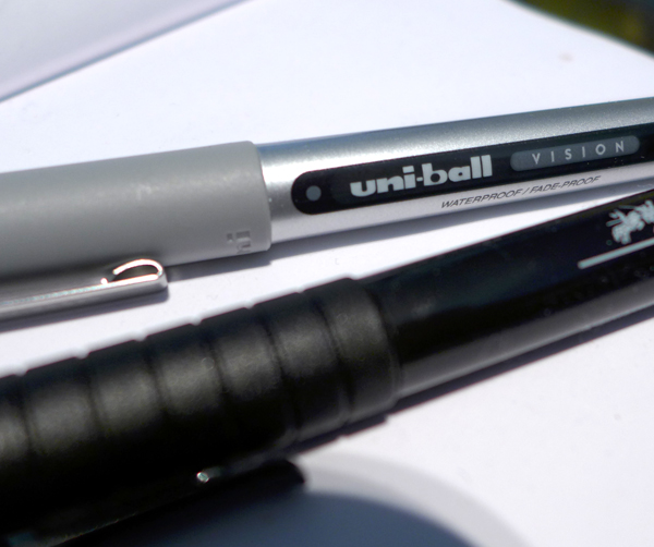 找到合适的工具来为客户手绘很重要。我是Uni-Bal Vision的忠实粉丝,它是防水的。一支顺手的笔刷,可以很好地大面积填充深色墨水。