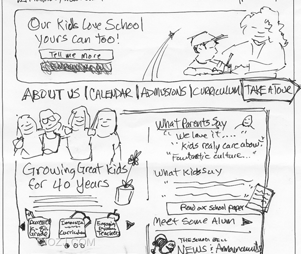 以此为例,这是我给一所私立学校设计网站时画的。目的就是避免花大量时间在高保真photoshop效果图上,也能把主页的线框图具象化。