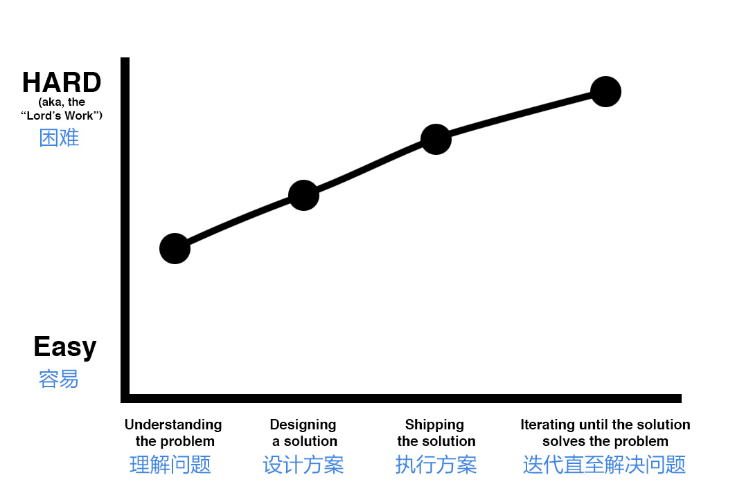 然而,这张图并未点出最后一个步骤所需要耗费的巨量时间。在真正顶级的创业团队中,设计师可能会为了解决某个问题重复一次又一次,直到最终找到解决方案。这也就意味着最后一个步骤可能是最难的那个部分,短则数月,长则数年。真正的顶尖设计师会勇于挑战且乐于挑战,不会过分计较获取结果所耗费的时间,只要最终能完成,不会纠结于那是3次迭代还是300次迭代才能获得。(初代iPhone酝酿了10年,研发了5年;Apple Watch也经过了长达3年的高强度研发)