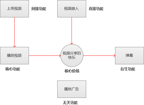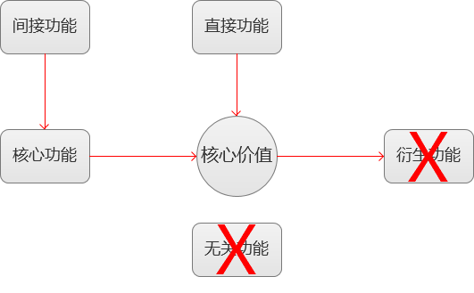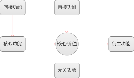 围绕核心价值我们所产出的功能可以分为四个类别:核心功能、直接功能、衍生功能、无关功能。举个例子: