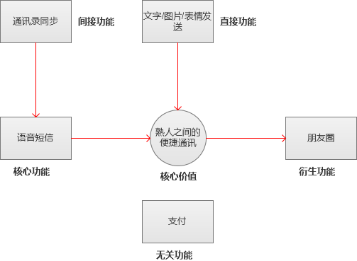 需要注意的是产品定位发生变化时,功能的性质是会随之改变的。沿用刚才微信的例子,对于一个IM软件来说朋友圈、支付都是与核心价值没有关系的功能;但当微信的定位由IM软件变为熟人社交后,朋友圈的功能性质便会发生变化,当其定位变的更大,不仅仅是熟人社交时,希望成为移动端的入口时,支付等其他功能的性质也会发生变化。