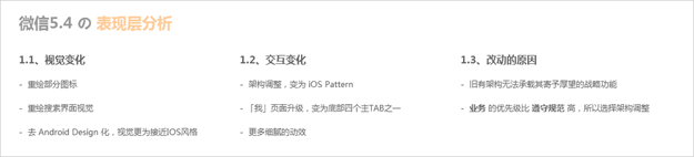 做完表现层分析,发现微信从安卓风格回归IOS风格的意图已经非常明显了,小珏对改动的理由也有了一定的猜测。同时小珏产生了更大的疑问:为什么在短短的3个月内,微信不惜一再的挑战用户习惯,在不同的设计风格之间摇摆?