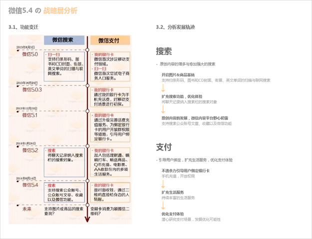 最后是战略层,这一步至关重要,在知乎上很多人讨论的非常好,但是仍然只局限于前两个层面的分析,而止步于战略层。在这一步,我们需要回溯早前的若干版本,把某一功能的发展罗列出来,情报来源可以是知乎,微博,微信,百度,尝试使用不同的单词组合搜索会有意想不到的惊喜。