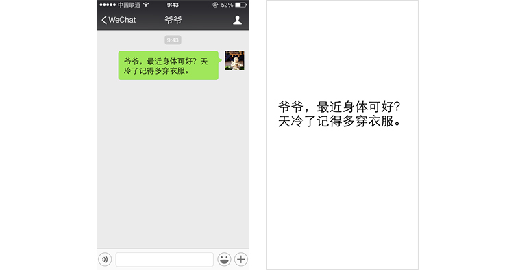 产品服务的是大多数用户,但也必须考虑到特殊情况,为特殊情况设计能体现出对用户的关怀。如微信设计的文字放大功能,能很好地关怀到中老年人,双击文字消息全屏放大显示,解决了中老年人视觉不好的阅读障碍。